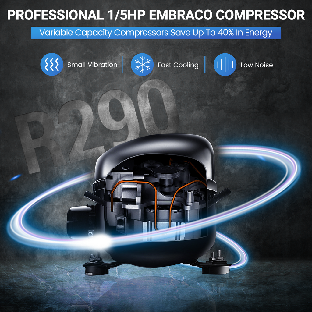 Intelligent Temperature Control - Fast Cooling -8°F~0°F (-22.2°C~-17.7°C). Carle controller displays digital temperature for easy monitoring. The fan cooling system ensures uniform cooling throughout. Automatic defrosting every 4 hours prevents frost or ice buildup
