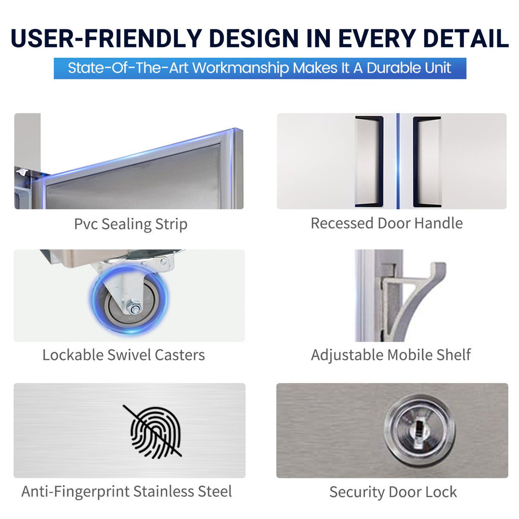 Design for Commercial Use - Equipped with heavy-duty wheels with brakes for free movement and placement of the freezer. Standardized door lock and key for privacy! 90-degree automatic door closing. Removable door seal. Removable mounting plate for easier access to condenser coils for cleaning and maintenance